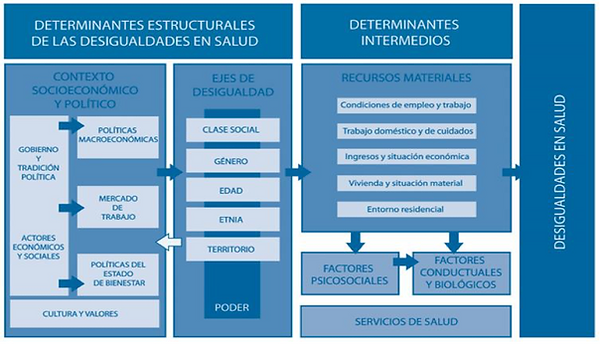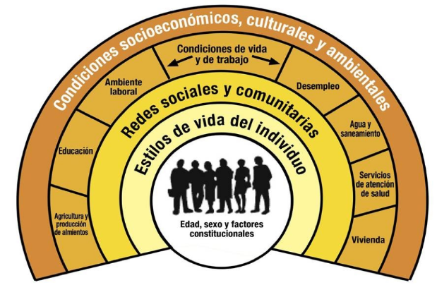 La Organización Mundial de la Salud (OMS) define los Determinantes Sociales de la Salud (DSS) como las circunstancias en las que las personas nacen, crecen, viven, trabajan y envejecen, incluido el sistema de salud. Esas circunstancias son el resultado de la distribución del dinero, el poder y los recursos a nivel mundial, nacional y local, que depende a su vez de las políticas adoptadas. Ejemplos de DSS incluyen las políticas del estado de bienestar, las condiciones de empleo y trabajo, los ingresos y situación económica, el entorno residencial, los servicios de salud y características sociales como la clase, el género, la edad, la etnia o el territorio.